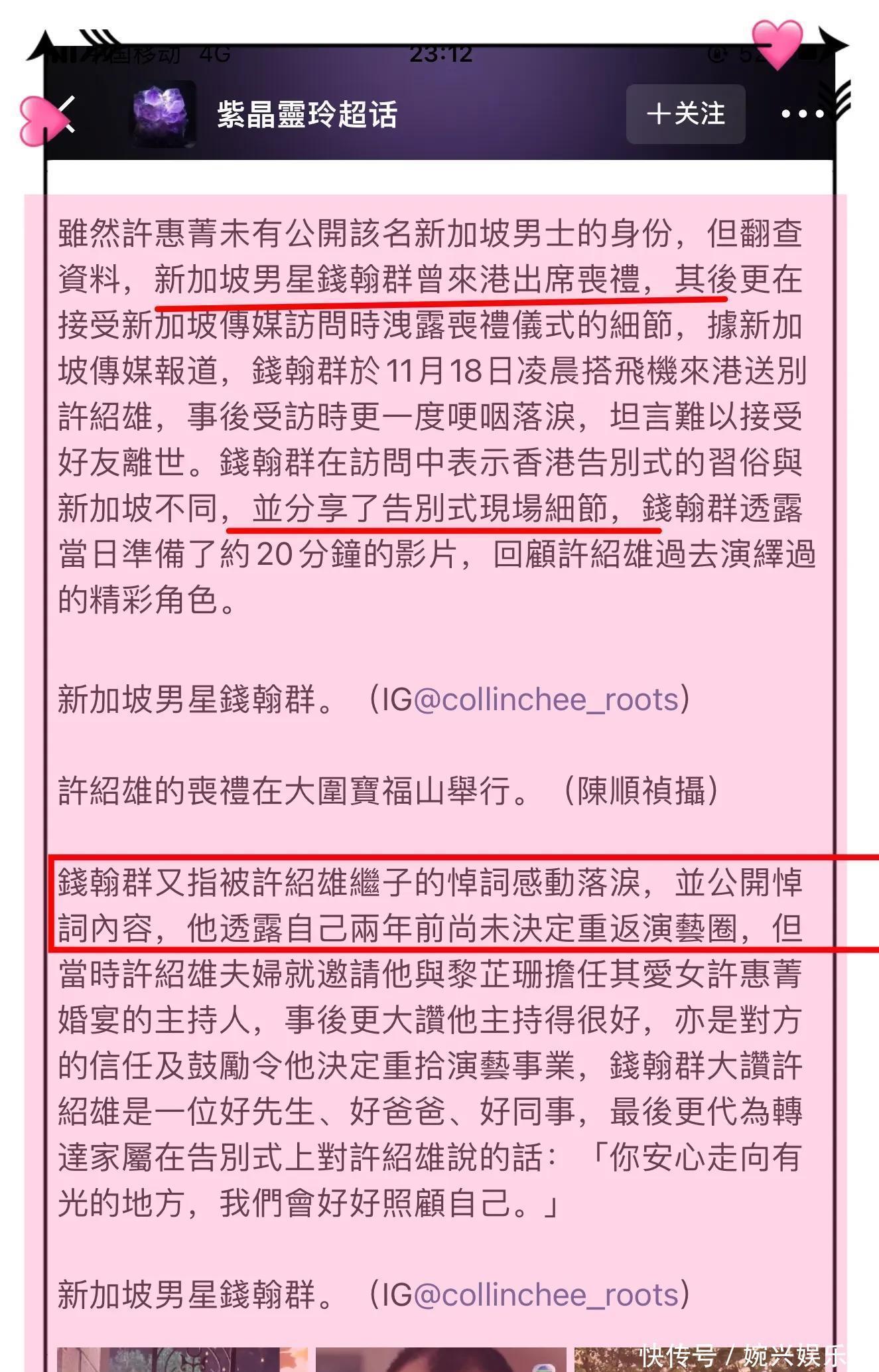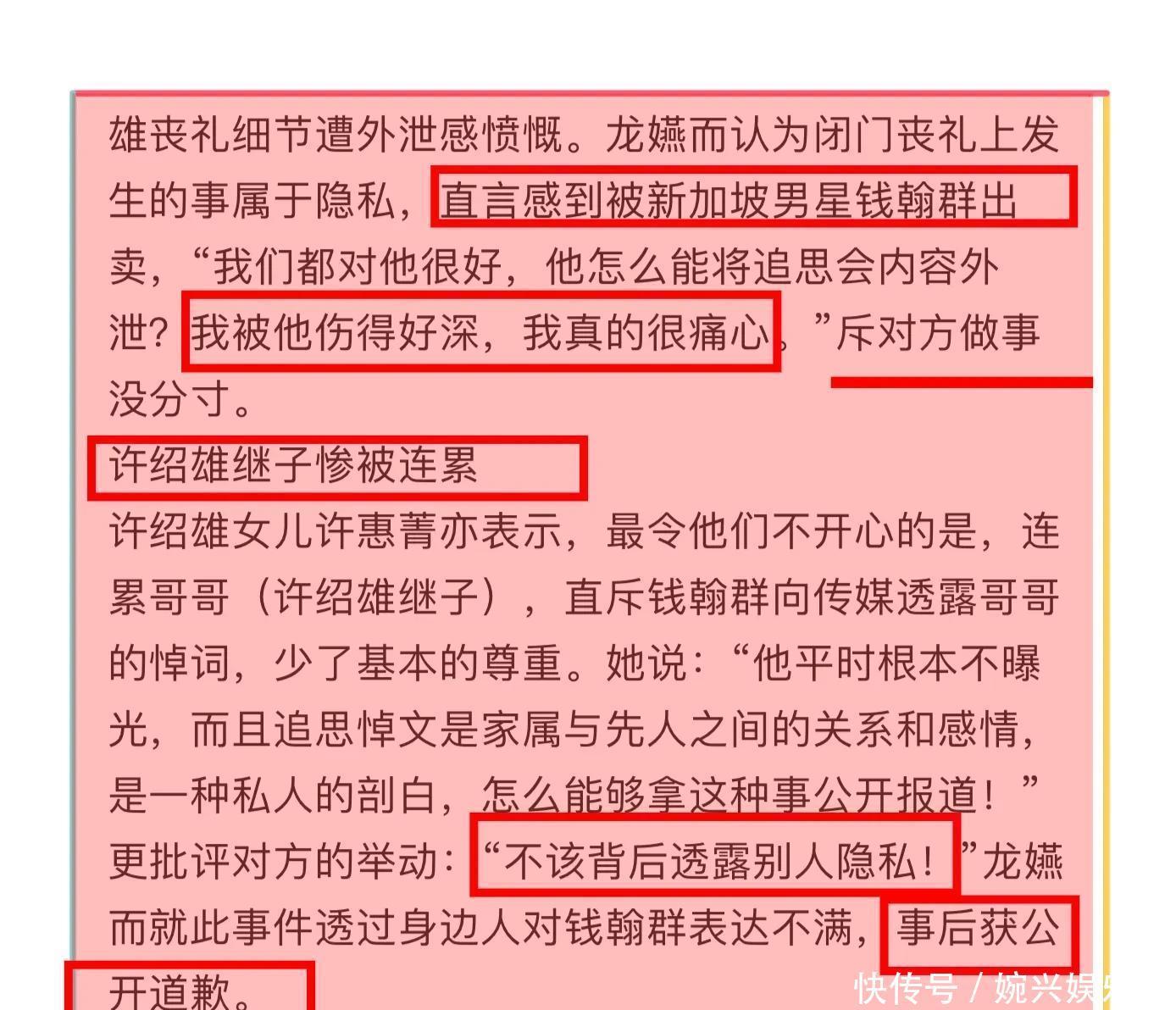 另外许绍雄家人怒斥钱翰群公开了许绍雄追悼会细节,包括许绍雄继子的悼词等,令他们很气愤,据悉钱翰群已经道歉!