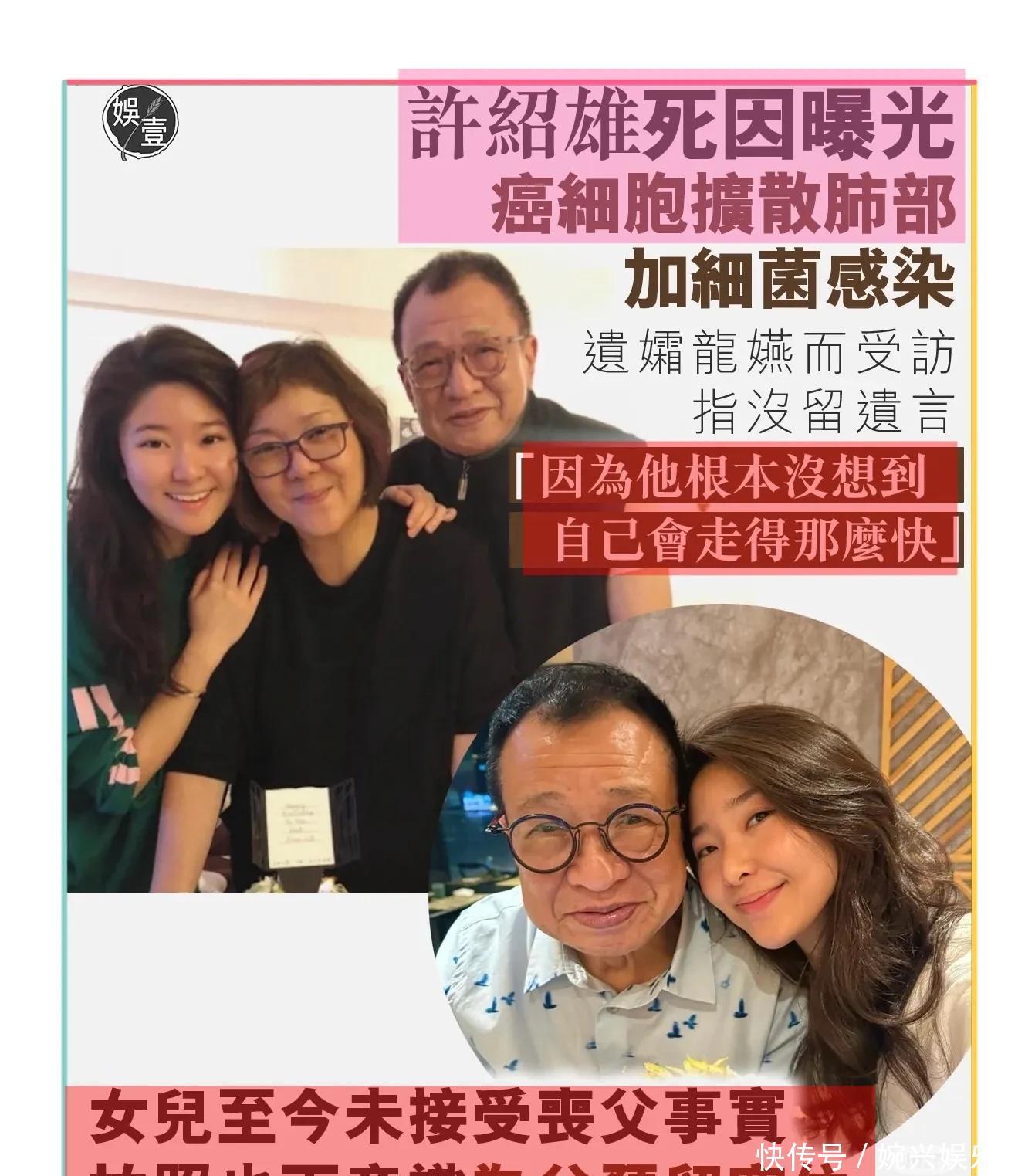许绍雄老婆和女儿表示一直接受不了他的离开,据悉许绍雄是去年九月份发现自己得了肾癌,一直积极治疗,没想到突然感染,癌细胞扩散,走的特别突然,以至于没有留下任何意义,据悉当时众多香港明星到医院看望欢喜哥,很多人守在其床边,久久不愿离开,直到他离世,虽然让人痛心,可是许绍雄弥留之际,有那么多好友陪伴,相信他也会很开心!